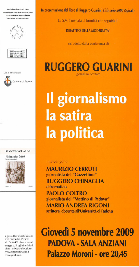 Dibattito in occasione della presentazione del libro di Ruggero Guarini, Fisimario 2008. Lettere immaginarie (Spirali 2009). Intervengono: Ruggero Guarini, giornalista e scrittore, Maurizio Cerruti, giornalista del Gazzettino, Ruggero Chinaglia, cifrematico, Paolo Coltro, giornalista del Mattino di Padova e Mario Andrea Rigoni, docente all'Università di Padova.